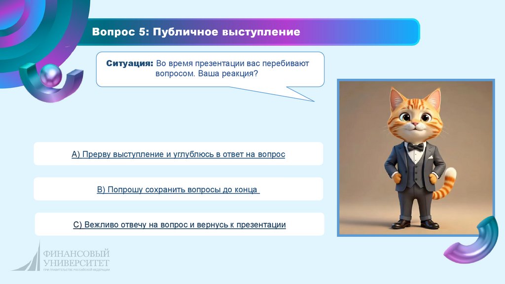 Вопрос 5: Публичное выступлениеСитуация: Во время презентации вас перебивают