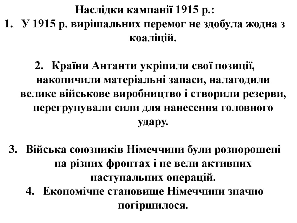 Наслідки кампанії 1915 р.:1. У 1915 р. вирішальних перемог не здобула жодна з