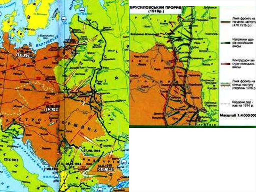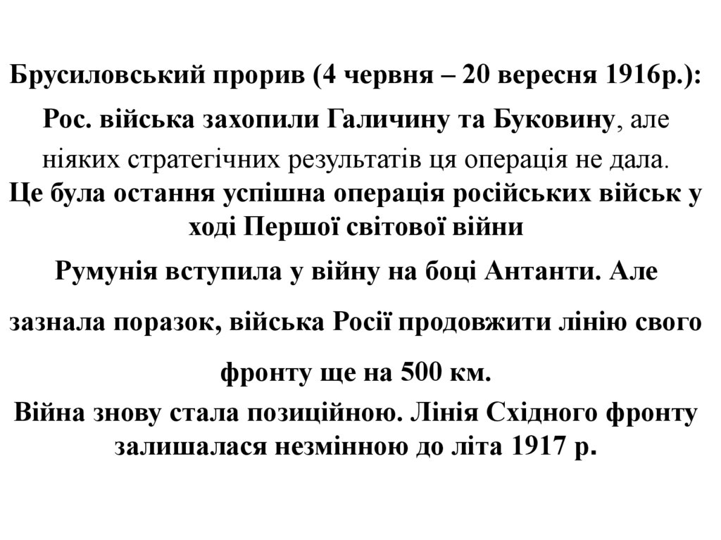 Брусиловський прорив (4 червня – 20 вересня 1916р.):Рос. війська захопили Галичину та Буковину, але