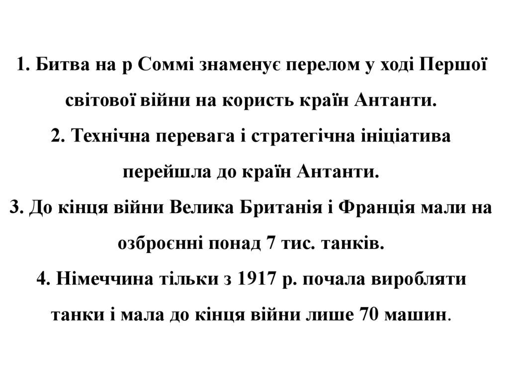 1. Битва на р Соммі знаменує перелом у ході Першоїсвітової війни на користь країн Антанти.