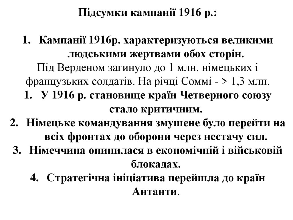 Підсумки кампанії 1916 р.:1. Кампанії 1916р. характеризуються великими