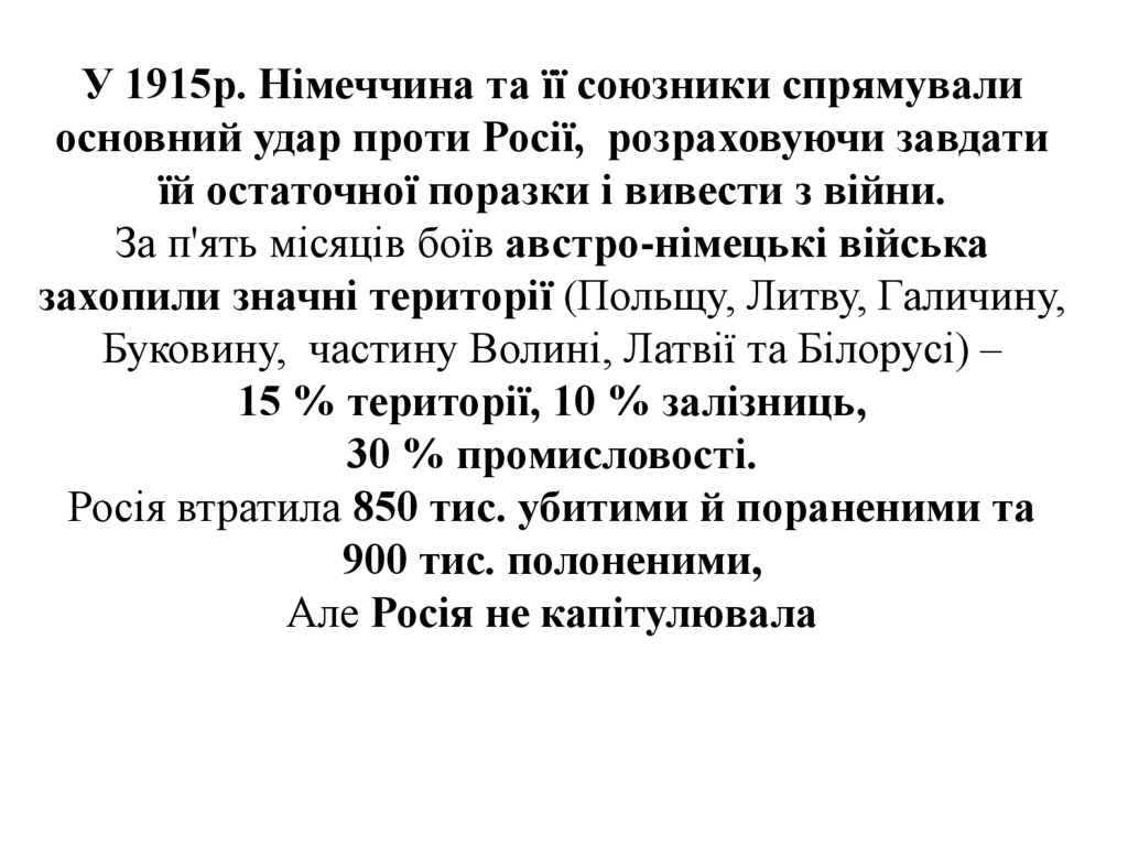 У 1915р. Німеччина та її союзники спрямувалиосновний удар проти Росії, розраховуючи завдати