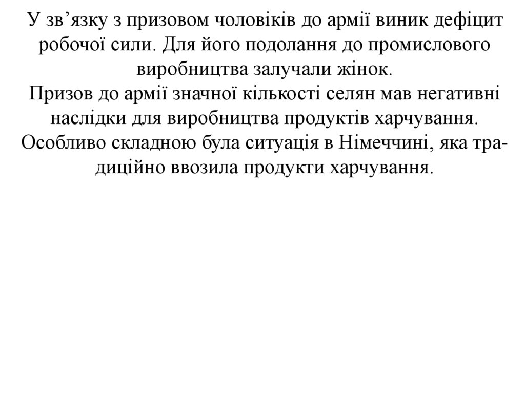 У зв’язку з призовом чоловіків до армії виник дефіцитробочої сили. Для його подолання до промислового