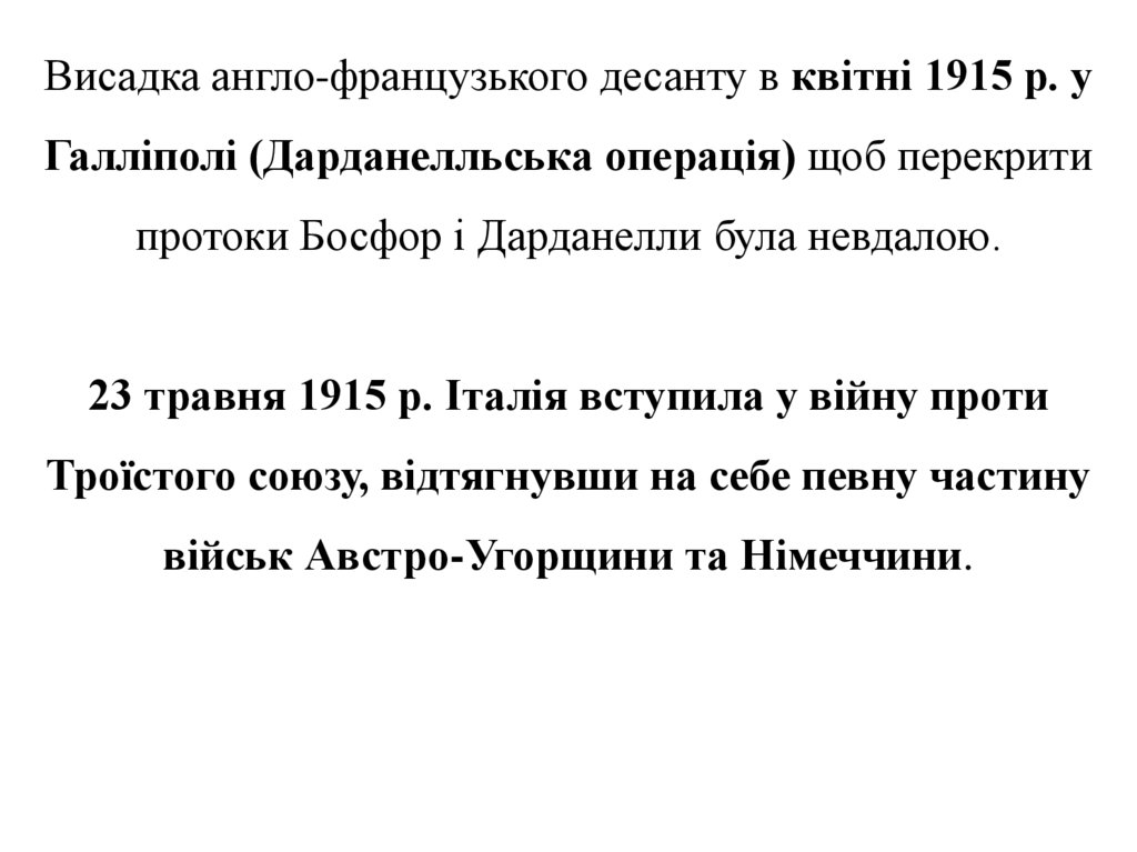 Висадка англо-французького десанту в квітні 1915 р. уГалліполі (Дарданелльська операція) щоб перекрити