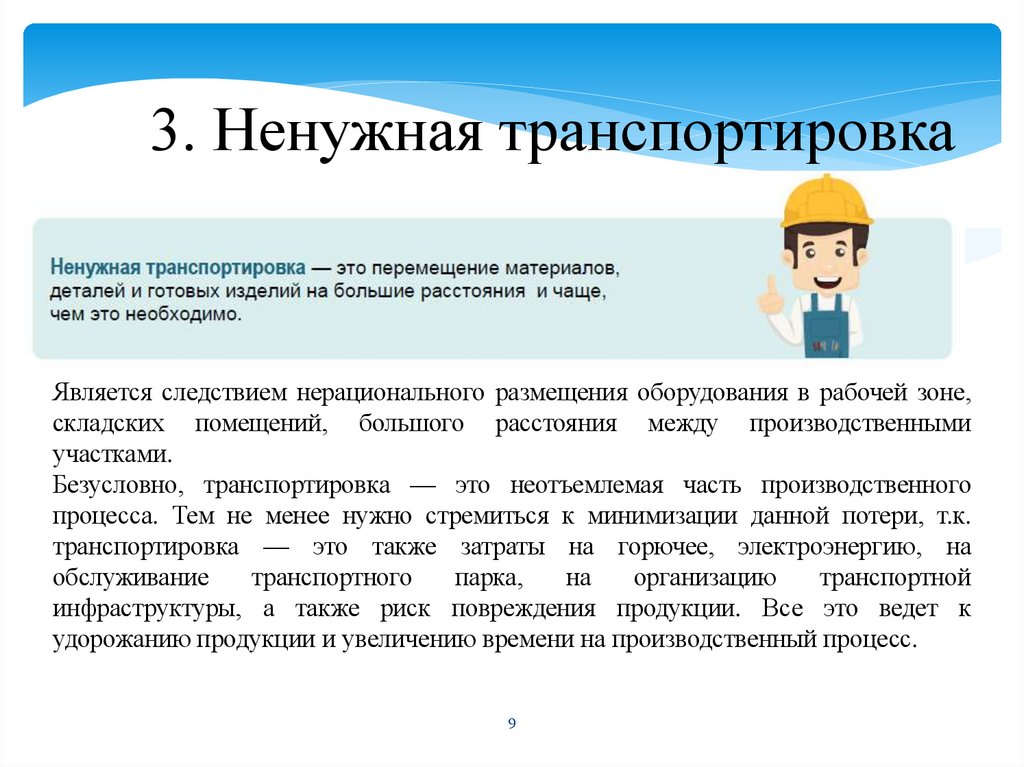 3. Ненужная транспортировкаЯвляется следствием нерационального размещения оборудования в рабочей зоне,