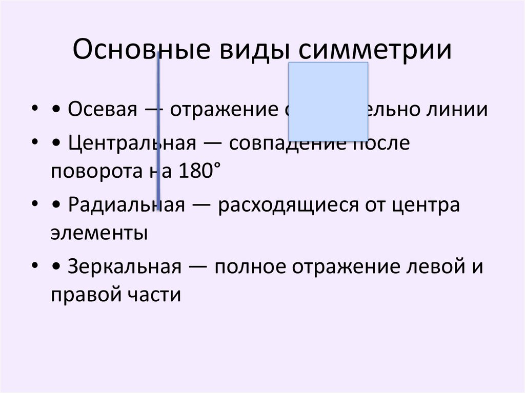 Основные виды симметрии• • Осевая — отражение относительно линии
