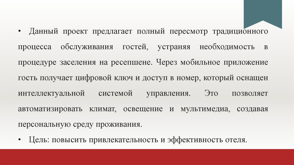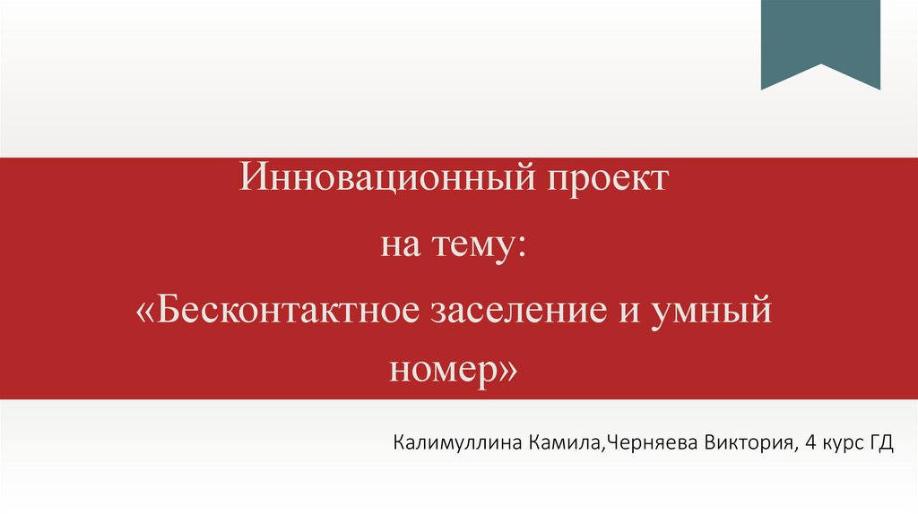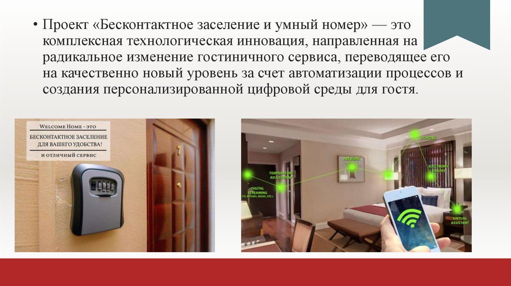 • Проект «Бесконтактное заселение и умный номер» — этокомплексная технологическая инновация, направленная на