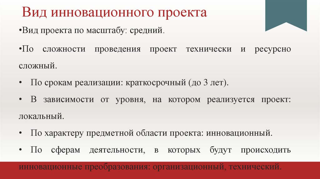 Вид инновационного проекта•Вид проекта по масштабу: средний.