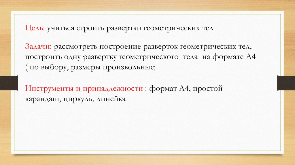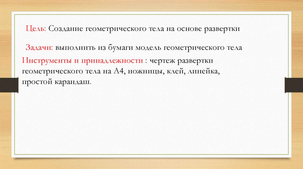 Цель: Создание геометрического тела на основе разверткиЗадачи: выполнить из бумаги модель геометрического тела