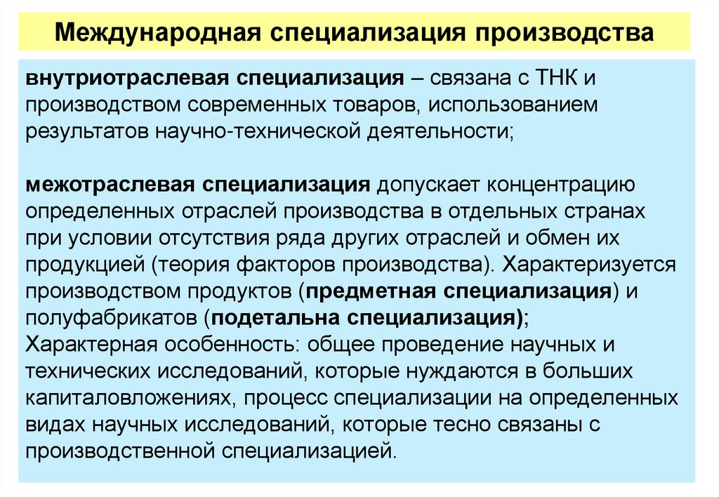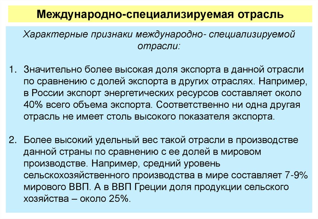 Международно-специализируемая отрасльХарактерные признаки международно- специализируемой