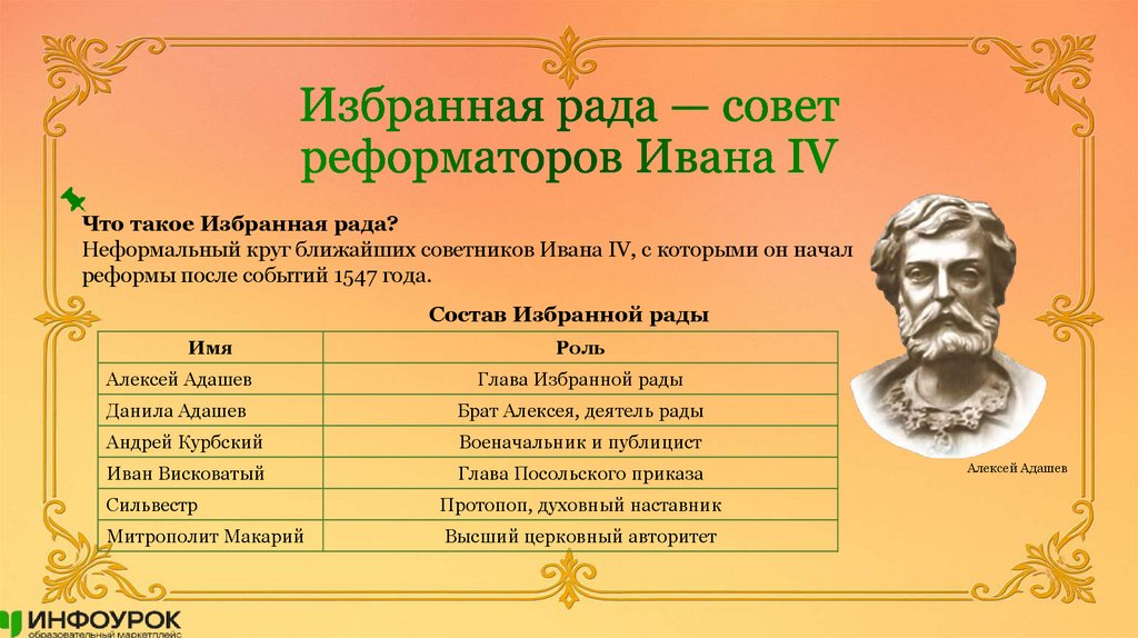 Что такое Избранная рада?Неформальный круг ближайших советников Ивана IV, с которыми он начал