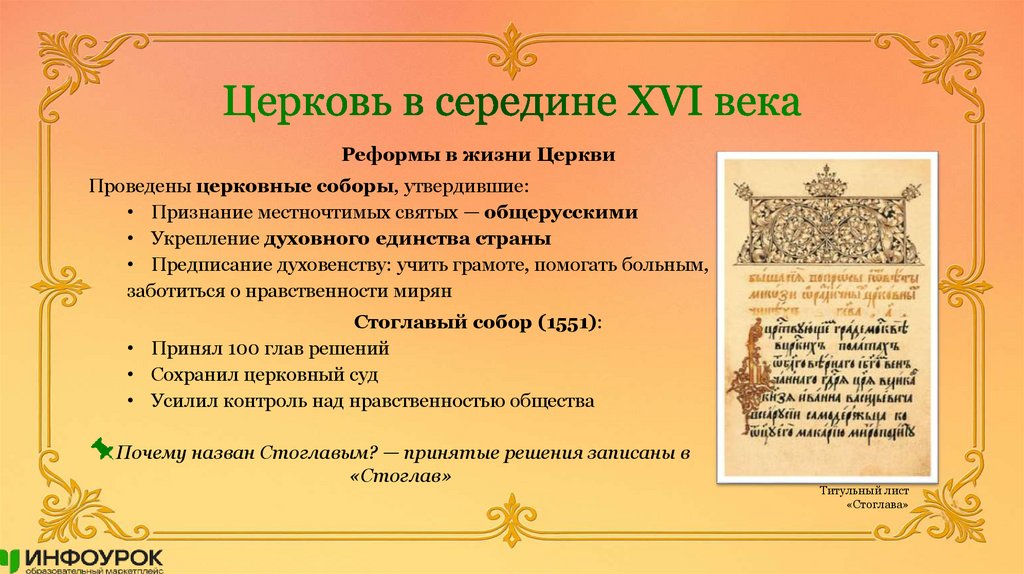 Реформы в жизни ЦерквиПроведены церковные соборы, утвердившие: