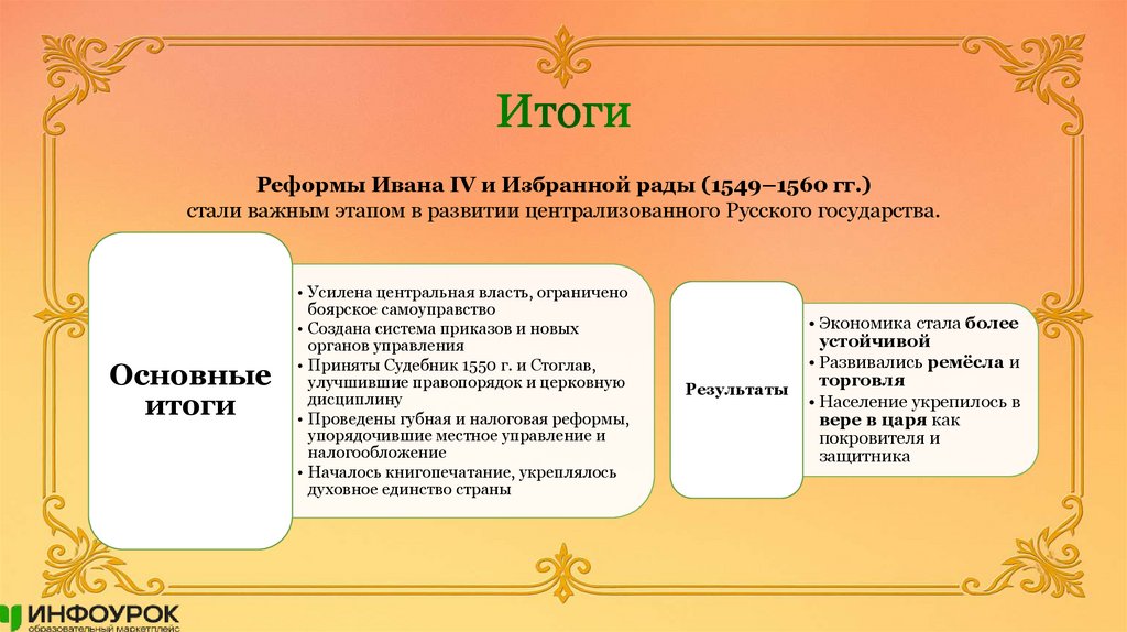 Реформы Ивана IV и Избранной рады (1549–1560 гг.)стали важным этапом в развитии централизованного Русского государства.