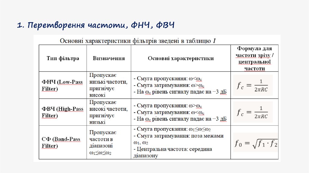 1. Перетворення частоти, ФНЧ, ФВЧОсновні характеристики: