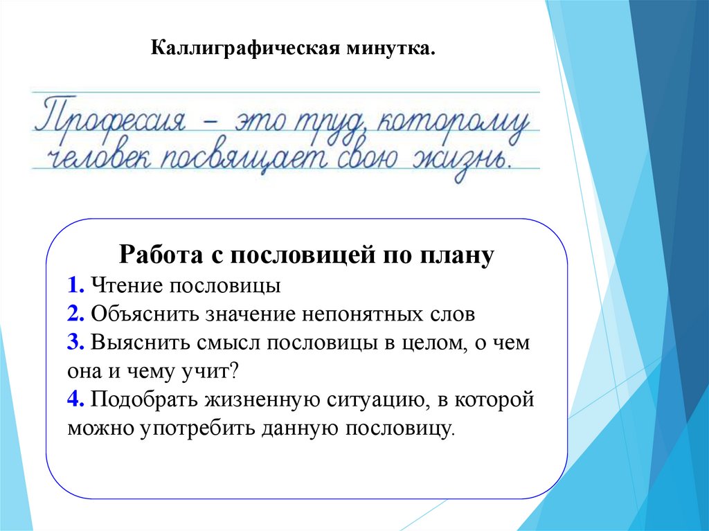 Каллиграфическая минутка.Работа с пословицей по плану