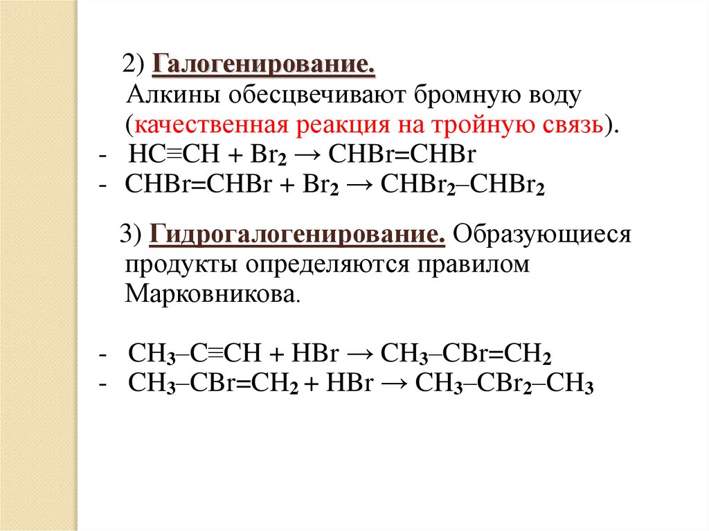 2) Галогенирование.Алкины обесцвечивают бромную воду