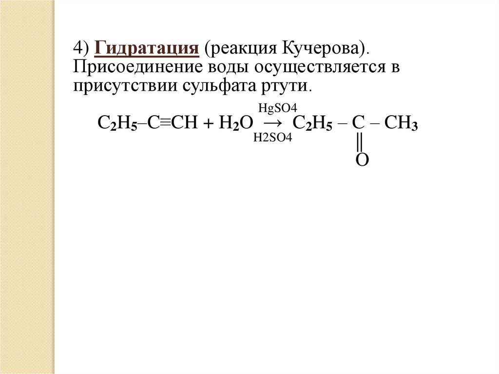 4) Гидратация (реакция Кучерова).Присоединение воды осуществляется в
