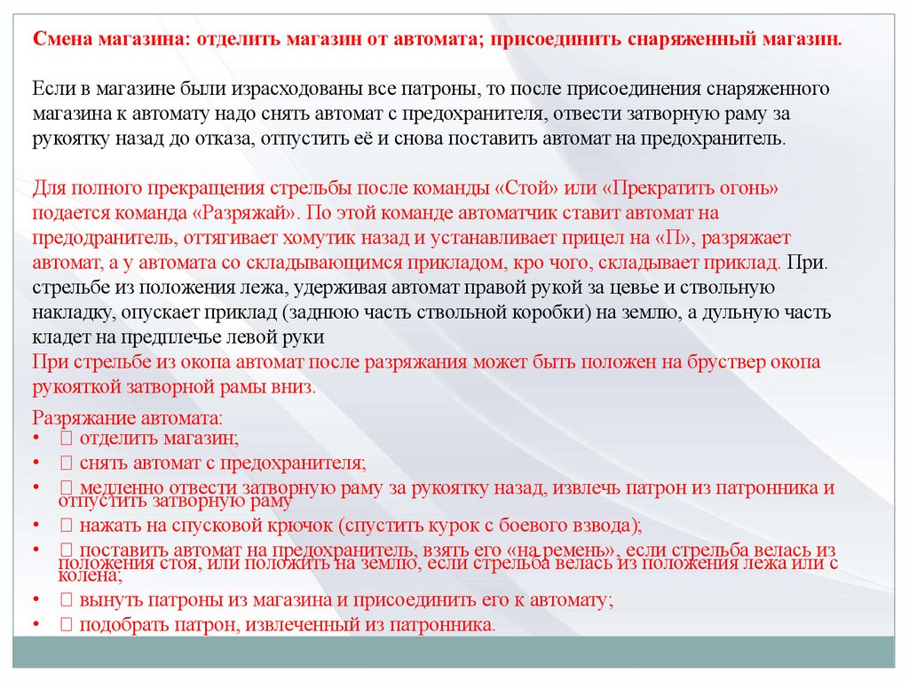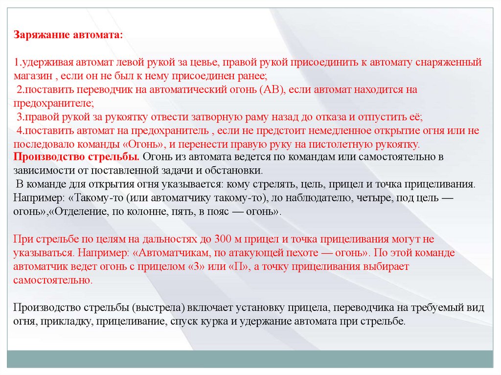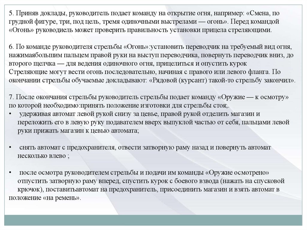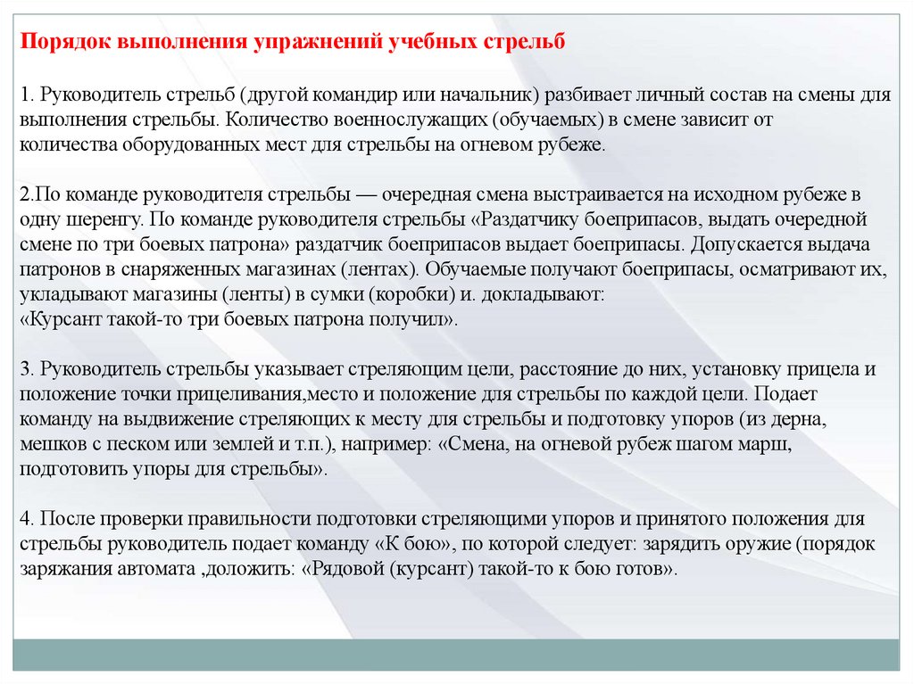 стрельбы руководитель подает команду «К бою», по которой следует: зарядить оружие (порядок