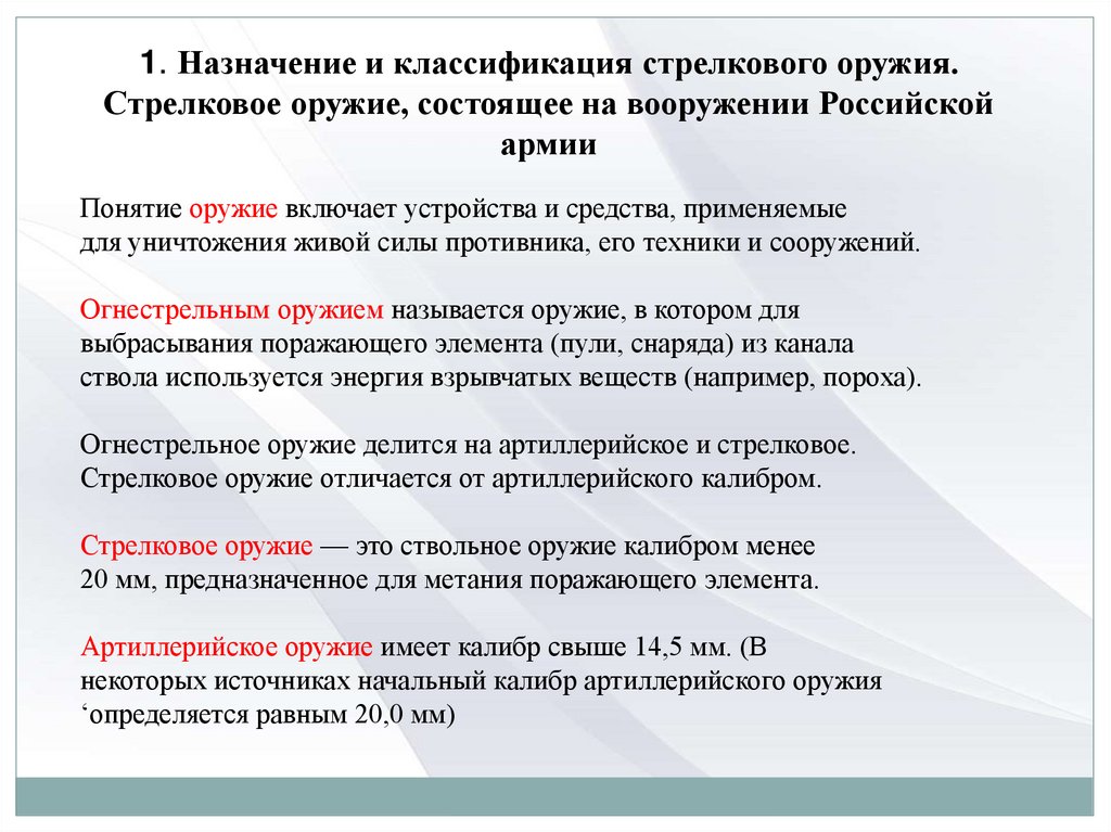 1. Назначение и классификация стрелкового оружия.Стрелковое оружие, состоящее на вооружении Российской