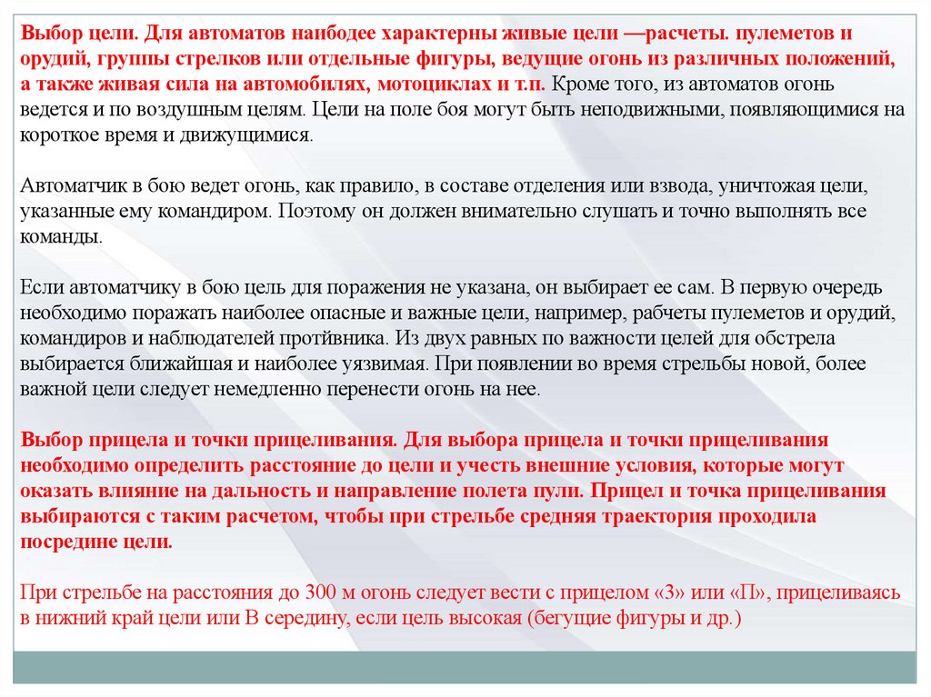 При стрельбе на расстояния до 300 м огонь следует вести с прицелом «3» или «П», прицеливаясь