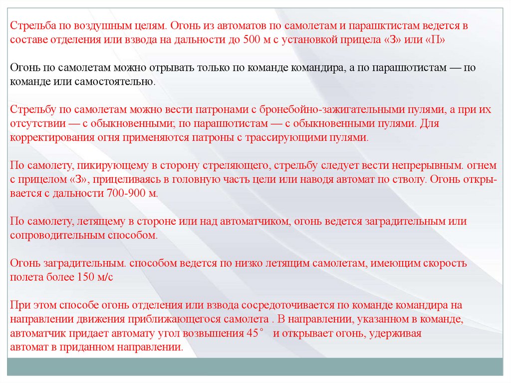 Стрельба по воздушным целям. Огонь из автоматов по самолетам и парашктистам ведется всоставе отделения или взвода на дальности до 500 м с установкой прицела «З» или «П»