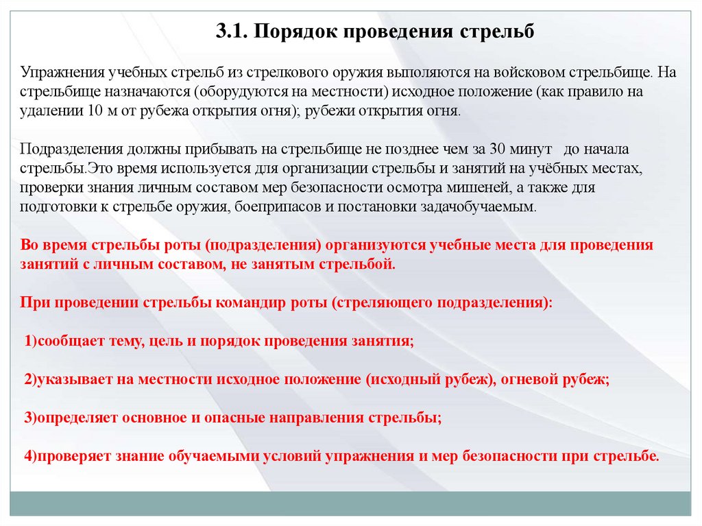 3.1. Порядок проведения стрельбУпражнения учебных стрельб из стрелкового оружия выполяются на войсковом стрельбище. На