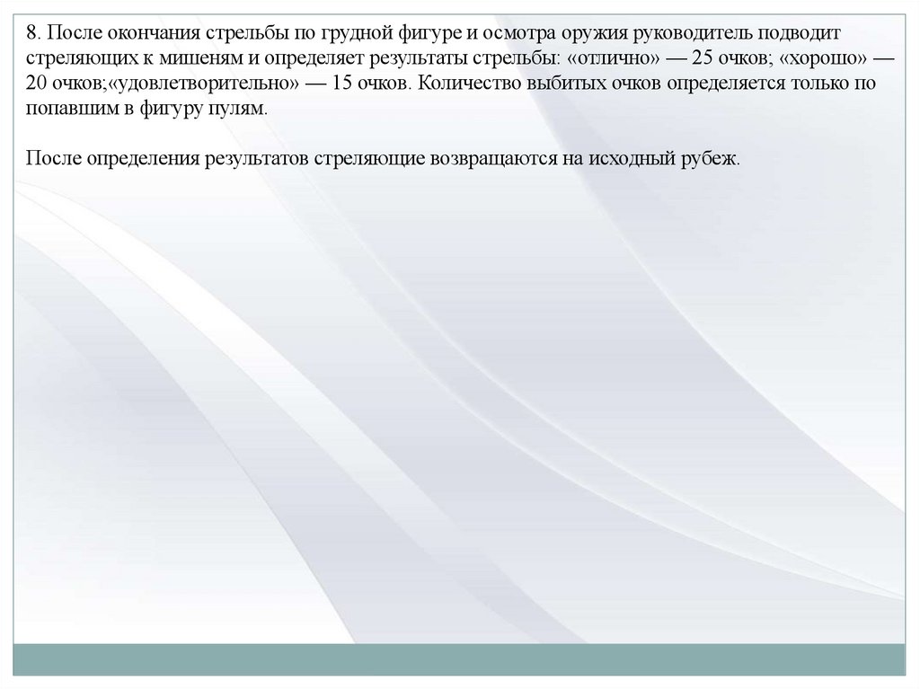 8. После окончания стрельбы по грудной фигуре и осмотра оружия руководитель подводитстреляющих к мишеням и определяет результаты стрельбы: «отлично» — 25 очков; «хорошо» —