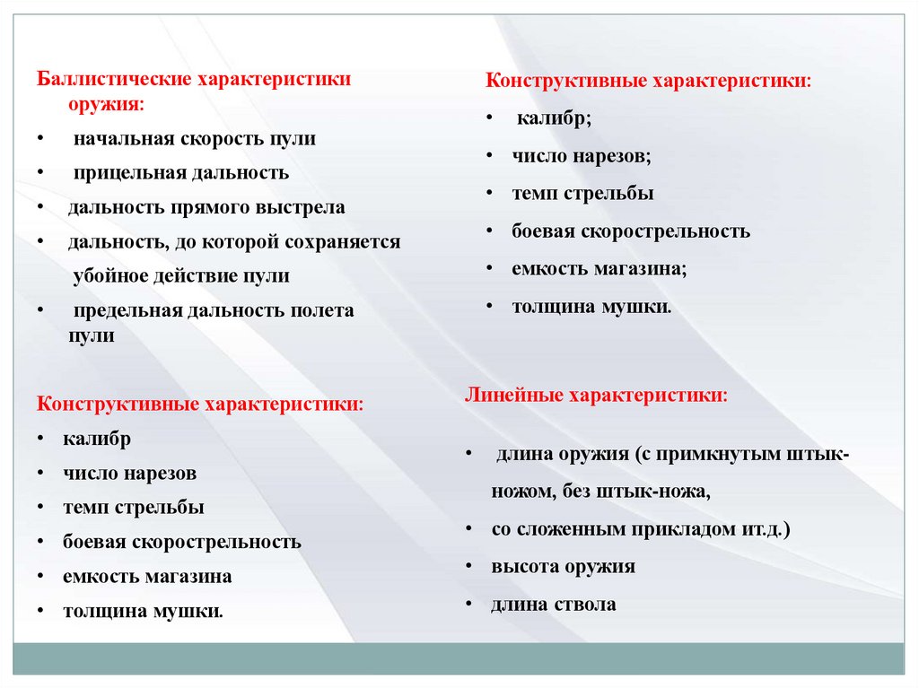Большинство вопросов внешней и внутренней баллистики,классификации и назначения оружия связано с тактикотехническими характеристиками (ТТХ) оружия, которые
