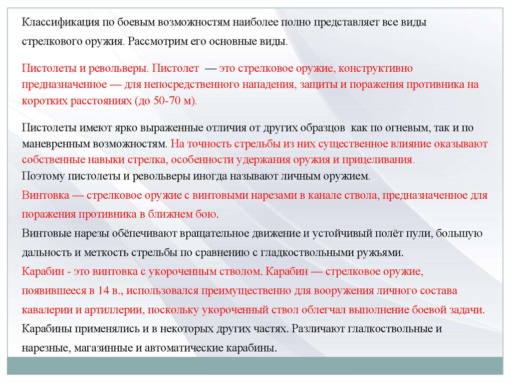 Классификация по боевым возможностям наиболее полно представляет все видыстрелкового оружия. Рассмотрим его основные виды.