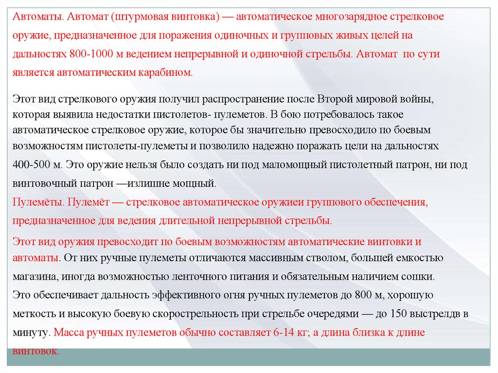 Автоматы. Автомат (штурмовая винтовка) — автоматическое многозарядное стрелковоеоружие, предназначенное для поражения одиночных и групповых живых целей на