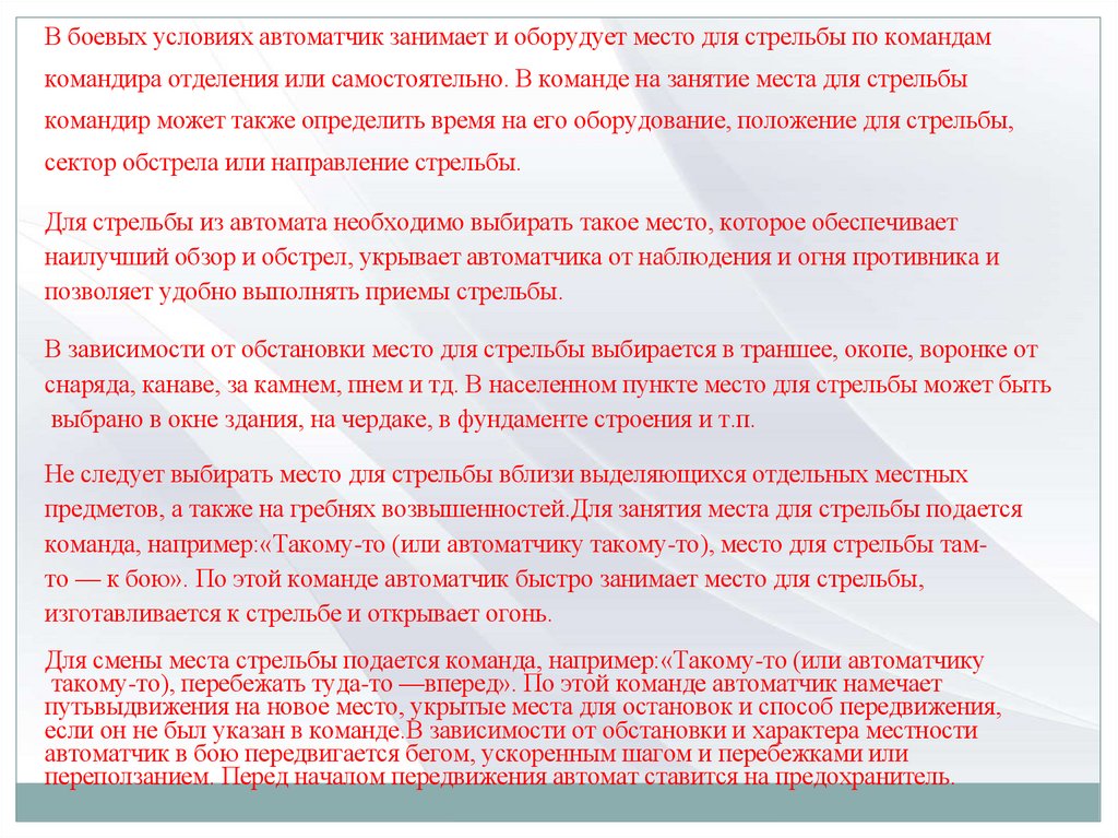 4)проверяет знание обучаемыми условий упражнения и мер безопасности при стрельбе.