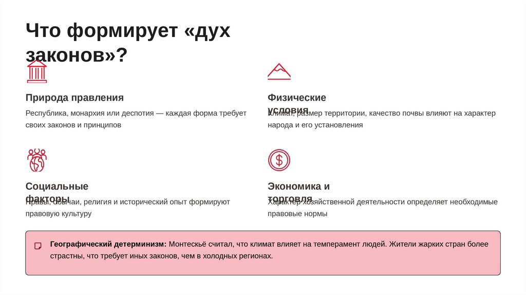 Географический детерминизм: Монтескьё считал, что климат влияет на темперамент людей. Жители жарких стран более