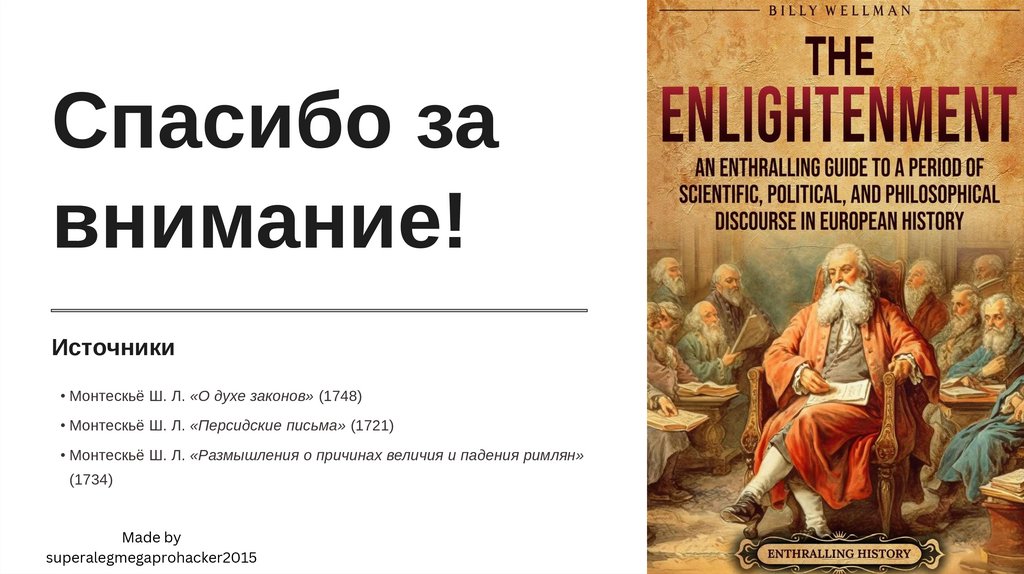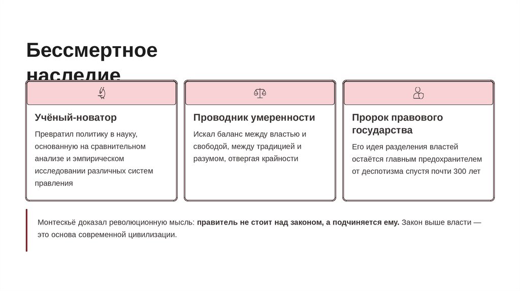 Монтескьё доказал революционную мысль: правитель не стоит над законом, а подчиняется ему. Закон выше власти —