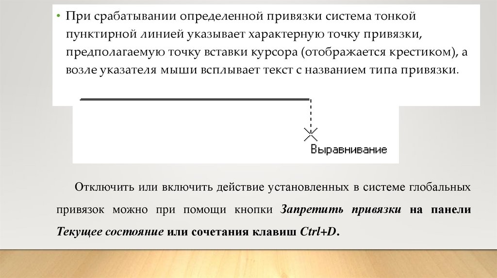 • При срабатывании определенной привязки система тонкойпунктирной линией указывает характерную точку привязки,