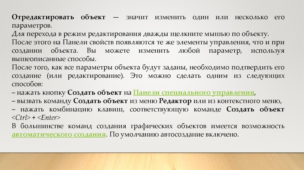 Отредактировать объект — значит изменить один или несколько егопараметров.