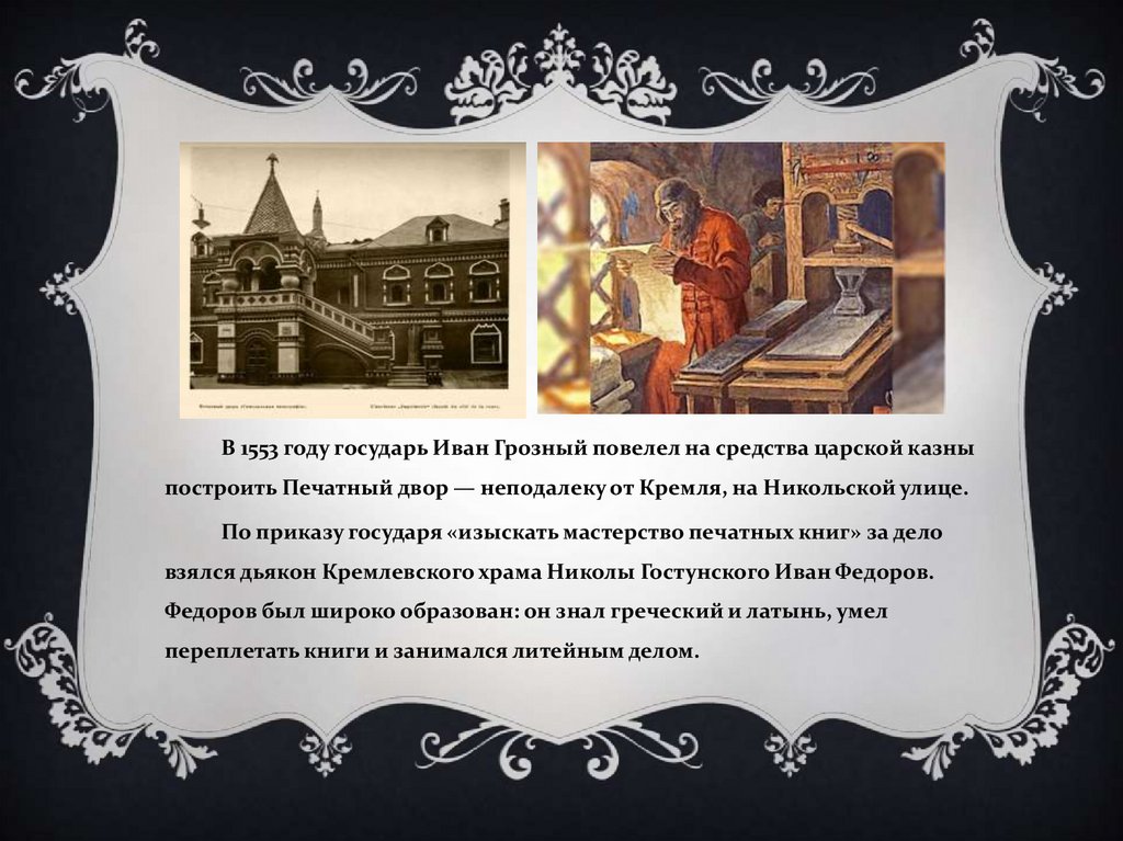 В 1553 году государь Иван Грозный повелел на средства царской казныпостроить Печатный двор — неподалеку от Кремля, на Никольской улице.