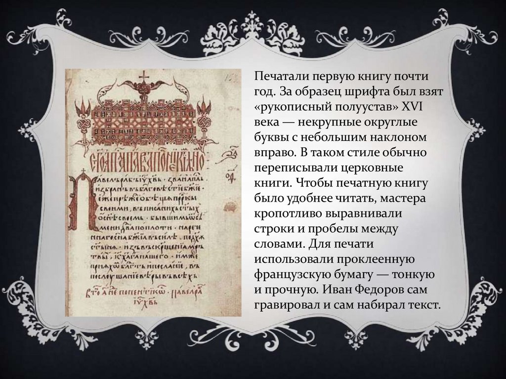 Печатали первую книгу почтигод. За образец шрифта был взят