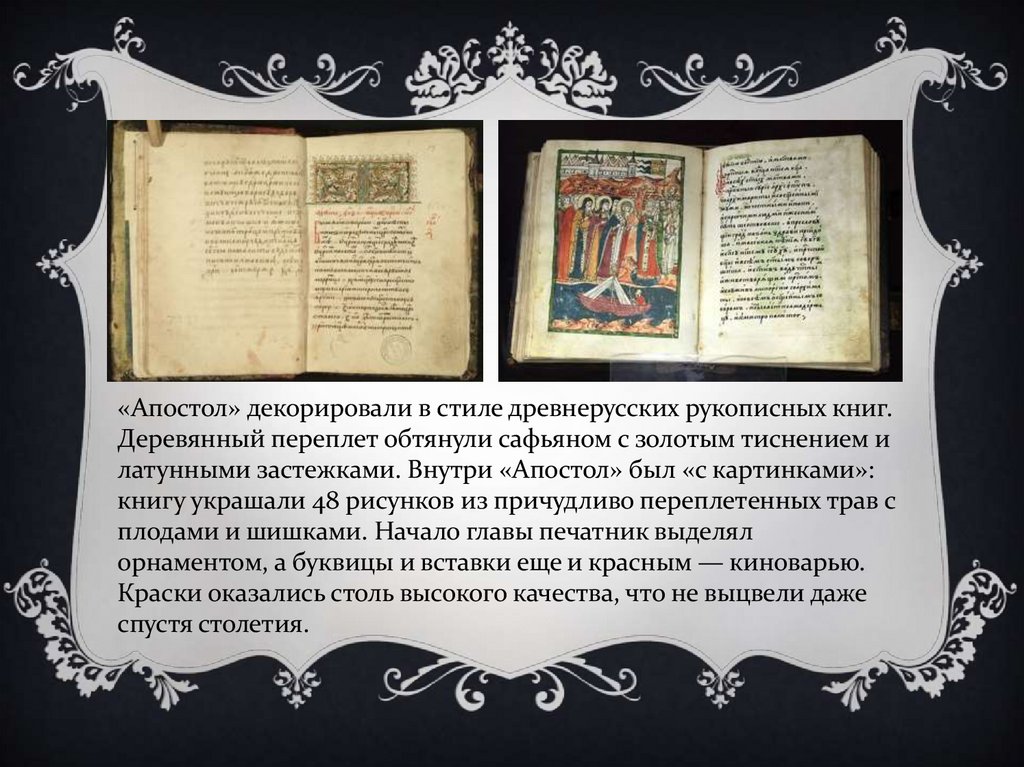 «Апостол» декорировали в стиле древнерусских рукописных книг.Деревянный переплет обтянули сафьяном с золотым тиснением и