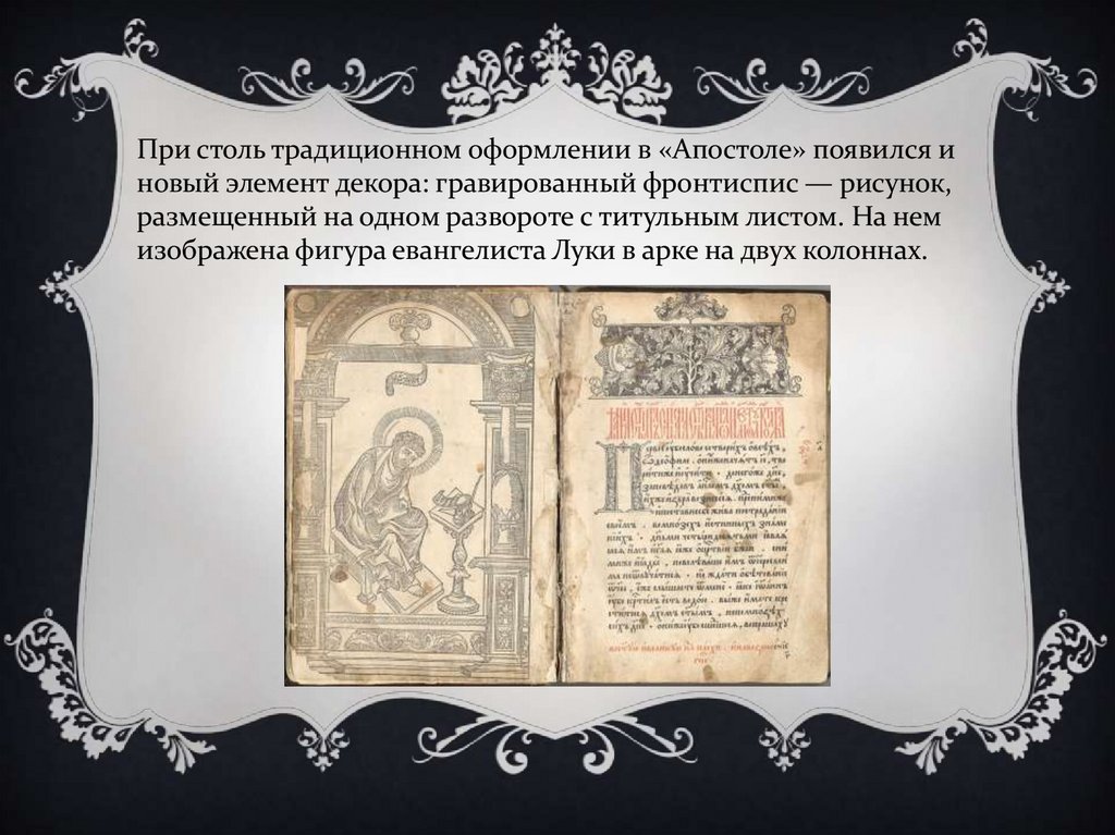 При столь традиционном оформлении в «Апостоле» появился иновый элемент декора: гравированный фронтиспис — рисунок,