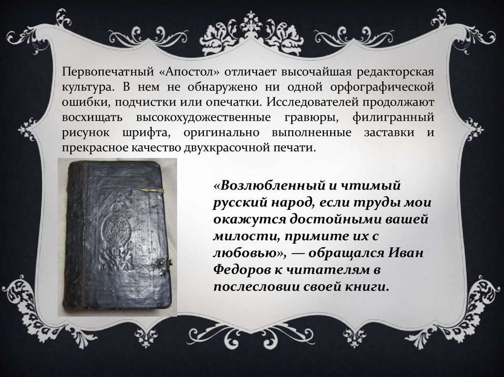 Первопечатный «Апостол» отличает высочайшая редакторскаякультура. В нем не обнаружено ни одной орфографической