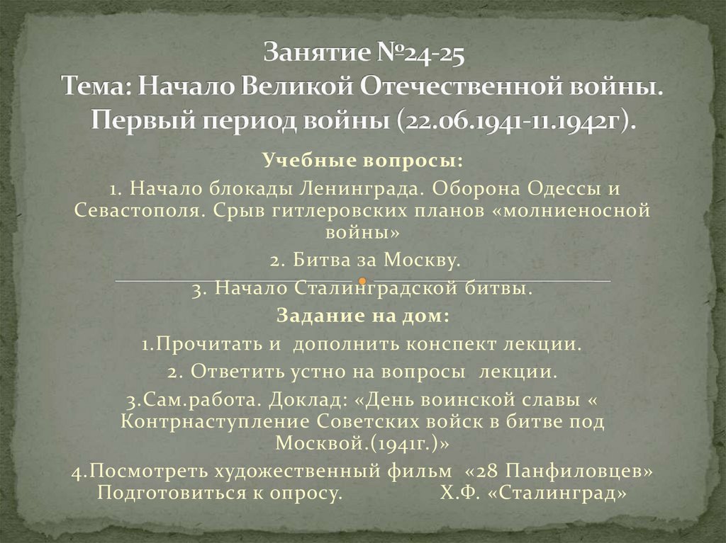 1. Занятие №24-25 Тема: Начало Великой Отечественной войны. Первый период войны (22.06.1941-11.1942г).