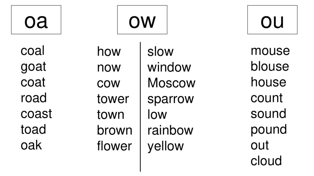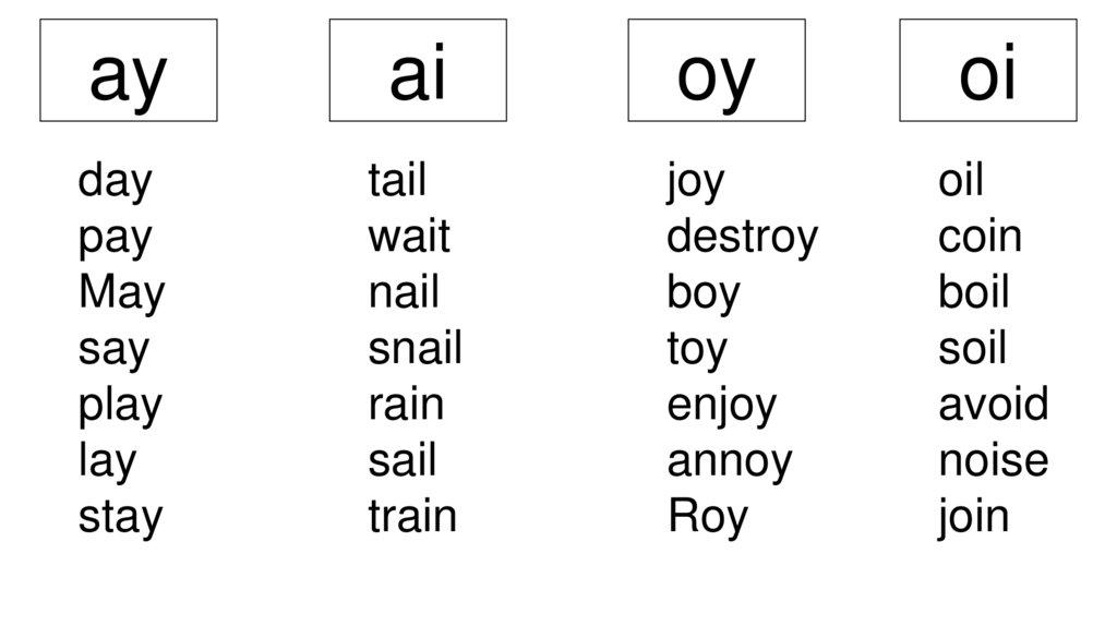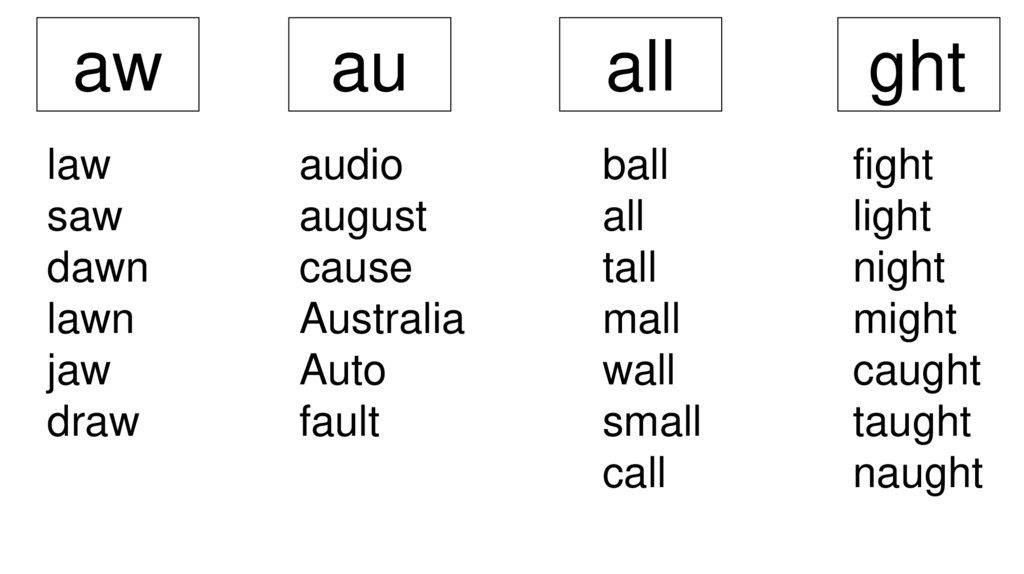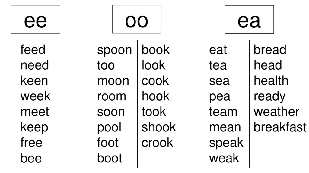 ee, oo, ea, oa, ow, ou, ay, ai, oy, oi, aw, au, all, ght,