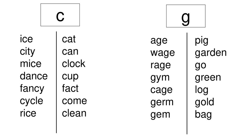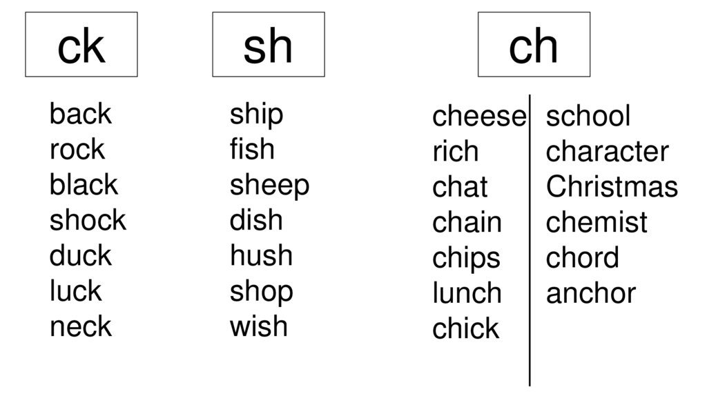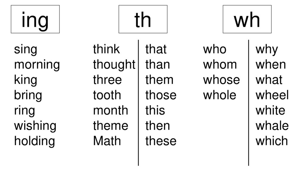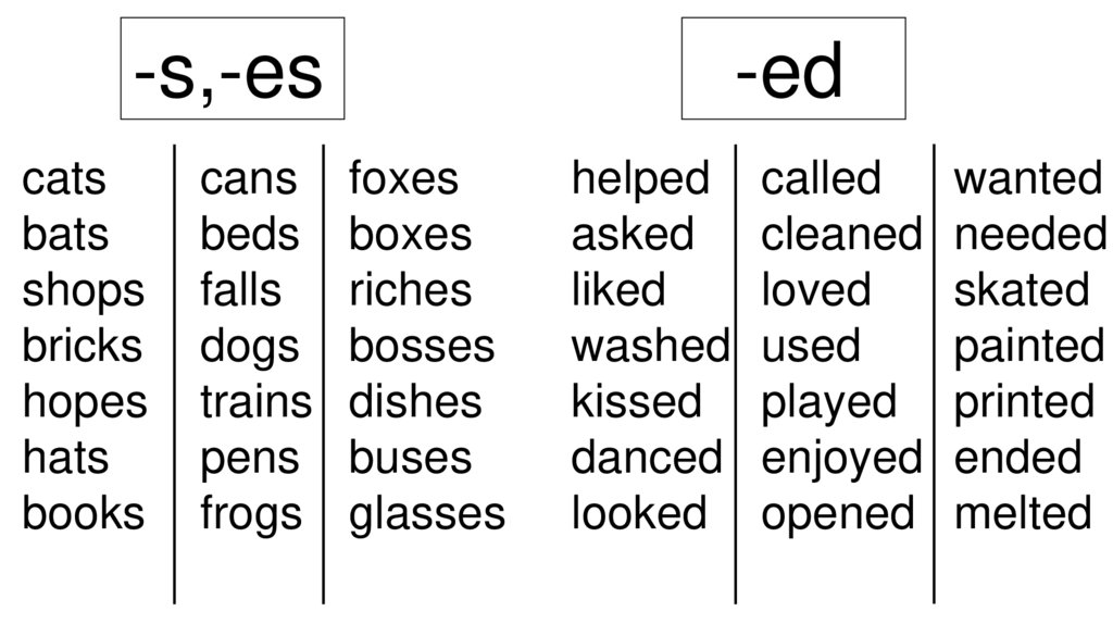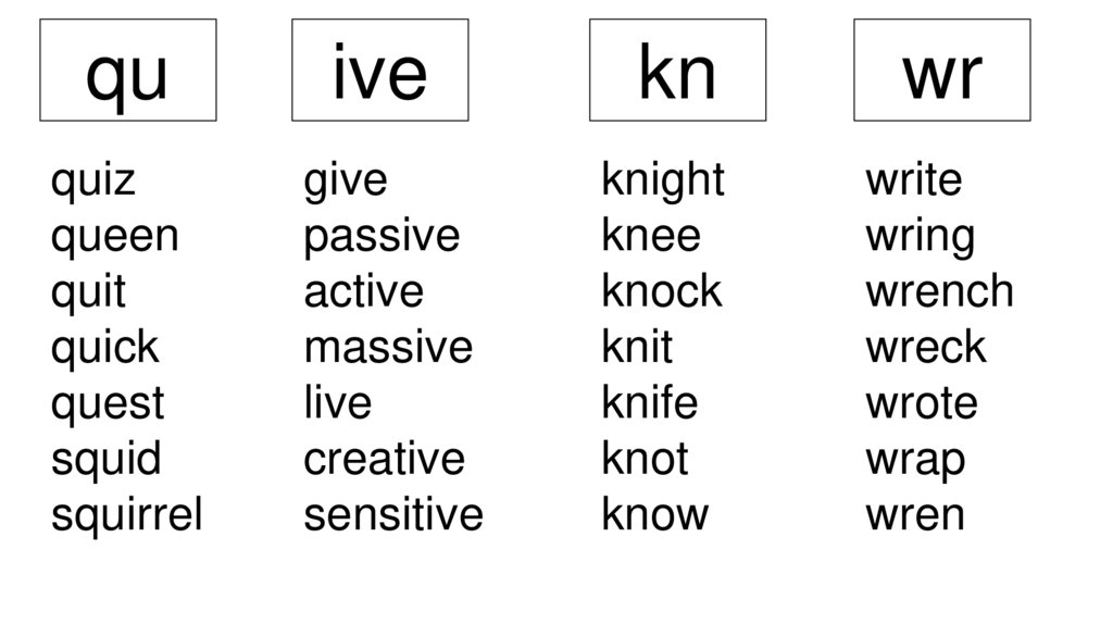 ck, sh, ch, ing, th, wh, qu, ive, kn, wr, c, g, -s, -es, -ed