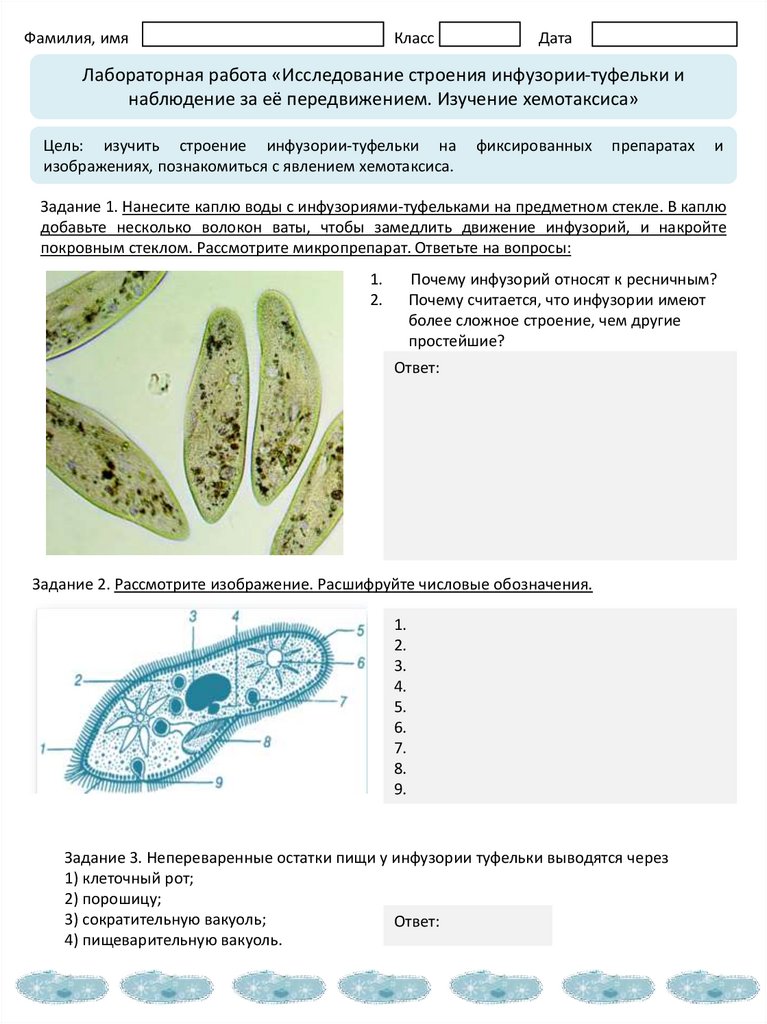 Задание 1. Нанесите каплю воды с инфузориями-туфельками на предметном стекле. В каплю