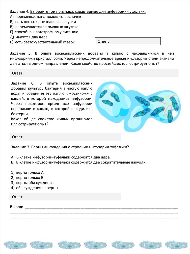 Задание 4. Выберите три признака, характерные для инфузории-туфельки.А) перемещается с помощью ресничек