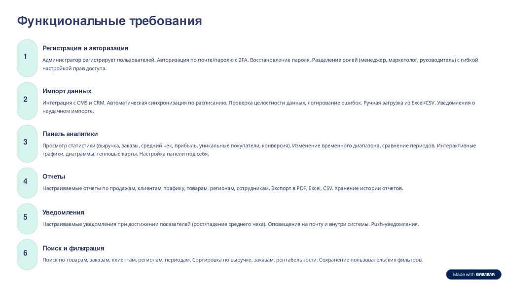 Администратор регистрирует пользователей. Авторизация по почте/паролю с 2FA. Восстановление пароля. Разделение ролей (менеджер, маркетолог, руководитель) с гибкой