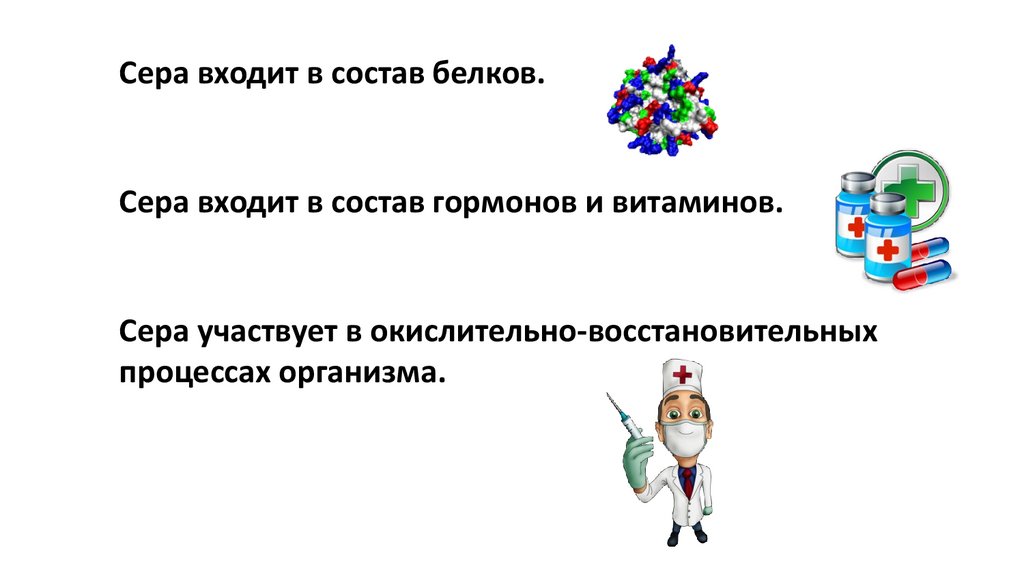 Сера входит в состав белков.Сера входит в состав гормонов и витаминов.