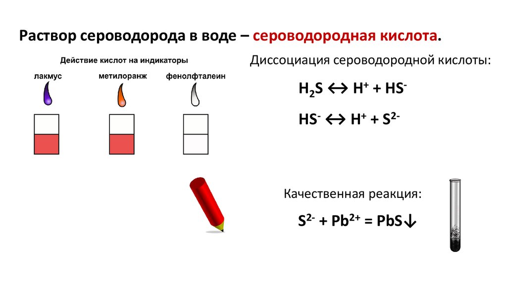 Раствор сероводорода в воде – сероводородная кислота.Диссоциация сероводородной кислоты: