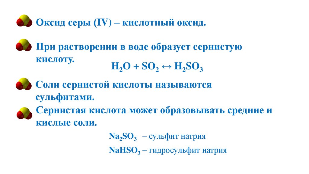 Оксид серы (IV) – кислотный оксид.При растворении в воде образует сернистую
