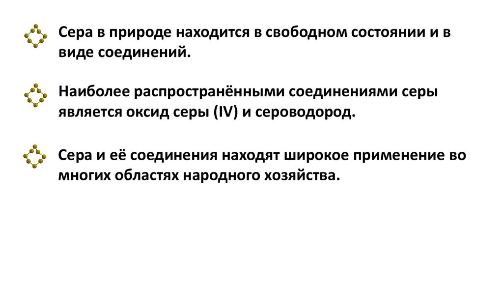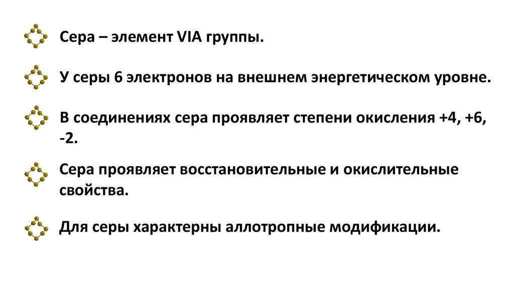 Сера – элемент VIA группы.У серы 6 электронов на внешнем энергетическом уровне.